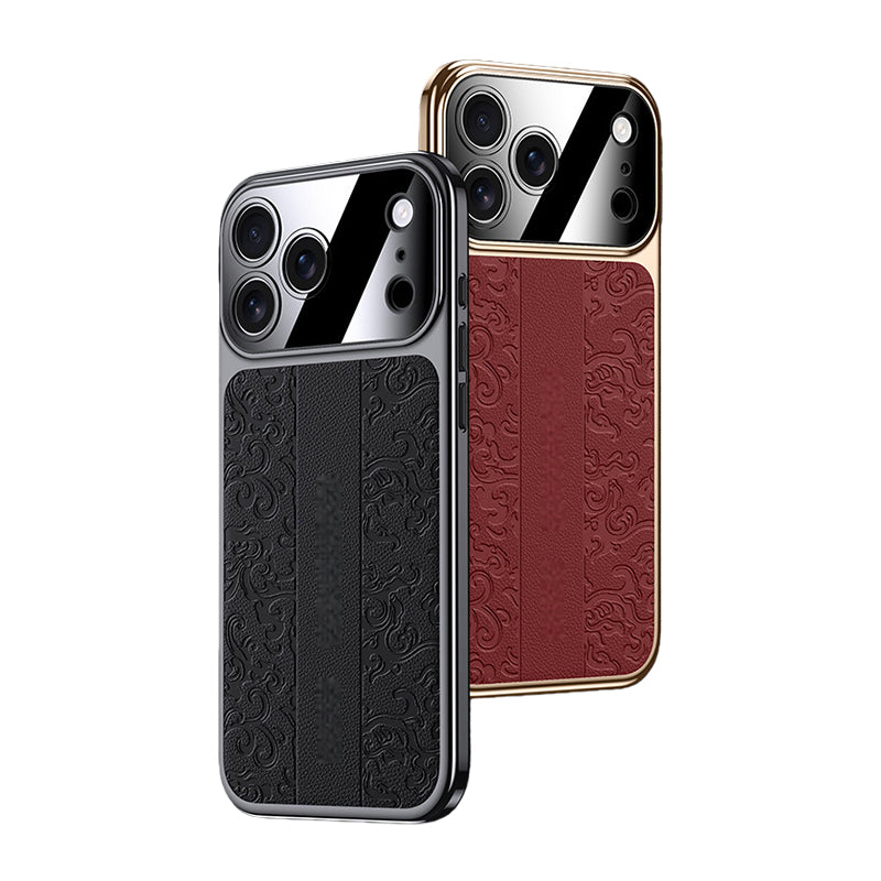 ![CASESUN dragon-embossed vegan leather case for iPhone 17 Pro Max with electroplated frame and raised camera protection]()