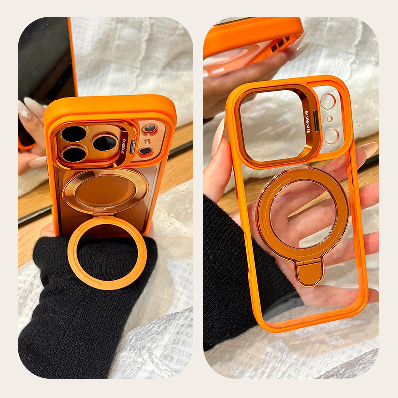 iPhone 17 Pro Max transparent magnetic stand case overall view, slim yet protective design.